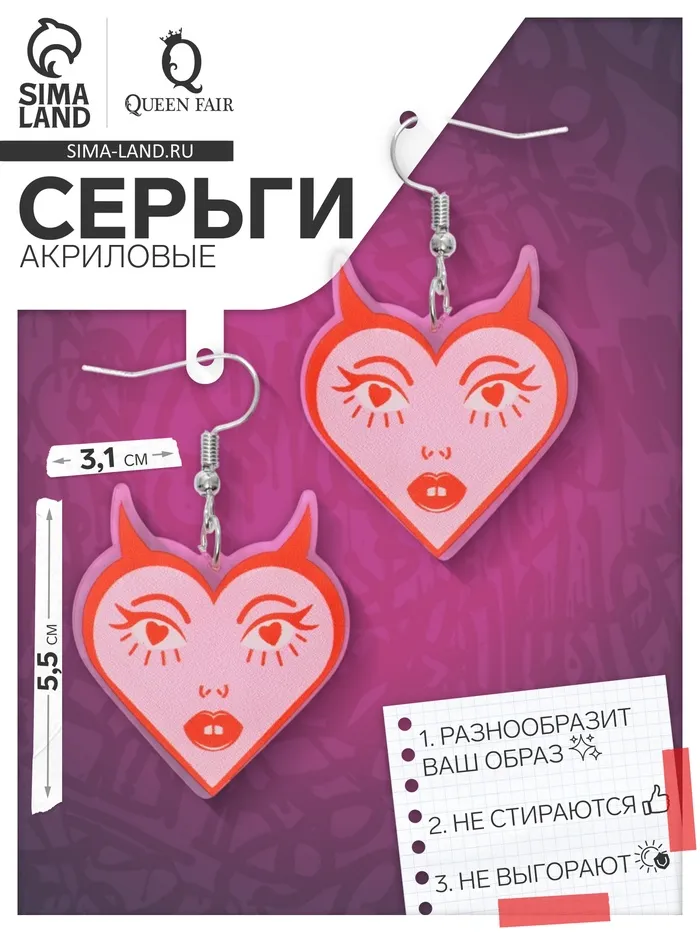 Серьги акриловые «Сердце» с лицом, цвет розово-красный — Характеристики