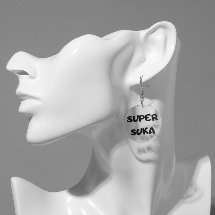 Металлическая основа с серебристым покрытием обеспечивает прочность и долговечность, а замок-петля гарантирует надёжную фиксацию и комфорт при носке. Надпись «Super suka» придаёт серьгам дерзкий характер, подчёркивая уверенность и свободный дух их обладательницы.