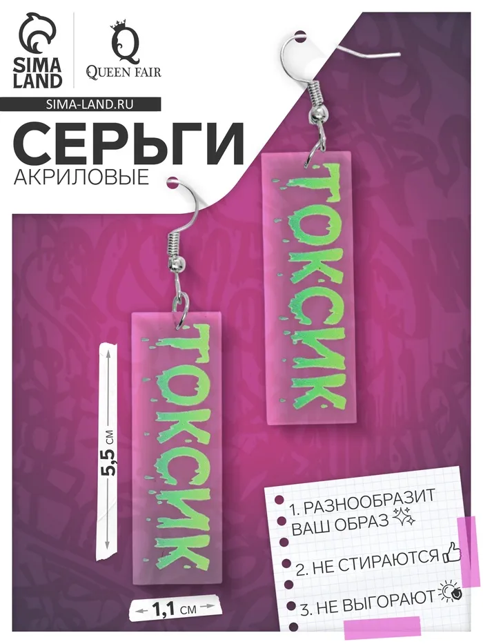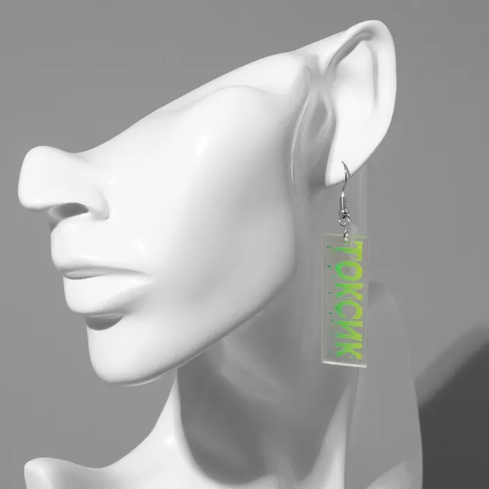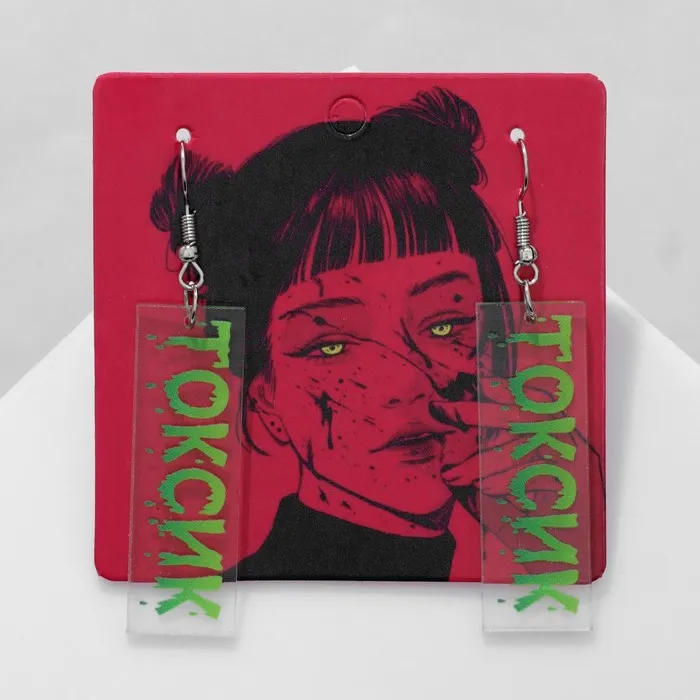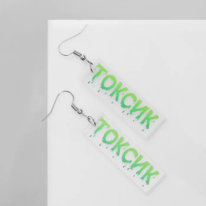 Металлическая основа с серебристым покрытием обеспечивает прочность и долговечность, а замок-петля гарантирует надёжную фиксацию и удобство в использовании. Универсальная тематика с надписью «Токсик» придаёт серьгам современный характер, идеально подходящий для женщин и девочек, ценящих индивидуальность и стиль.