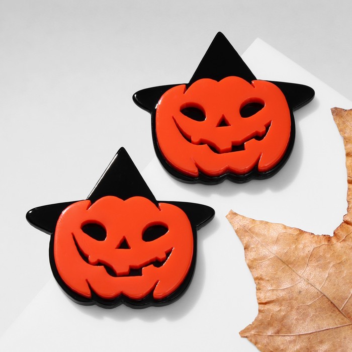 Серьги акриловые «Тыковки» в шляпах ведьм, цвет оранжевый в чёрном металле — Характеристики
