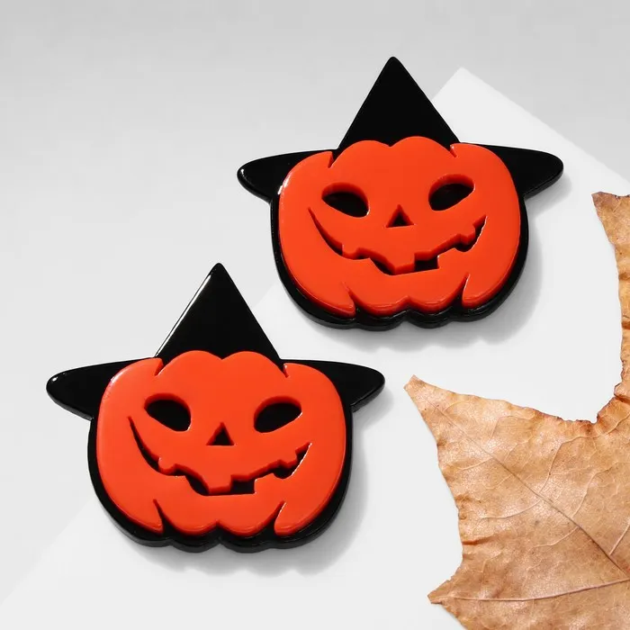 Яркие серьги с акриловыми тыквами в шляпах ведьм на чёрной металлической основе — стильный аксессуар длиной 3,8 см для женщин и девочек. Оранжевый цвет и тематический дизайн подчёркивают праздничное настроение Хэллоуина, придавая образу игривость и оригинальность.