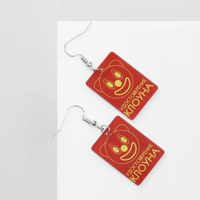 Яркие серьги с акриловой вставкой в виде «удостоверения клоуна» длиной 5 см — это смелый и оригинальный аксессуар, который добавит веселья и игривости в любой образ. Красно-жёлтая цветовая гамма привлекает внимание и подчёркивает индивидуальность, а серебристая металлическая основа придаёт серьгам современный и стильный вид.