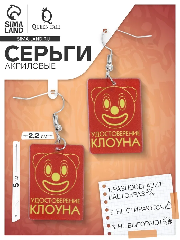 Серьги акриловые «Удостоверение клоуна», цвет красно-жёлтый — Характеристики