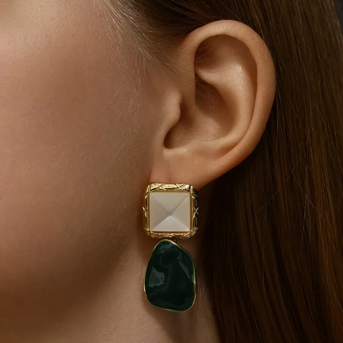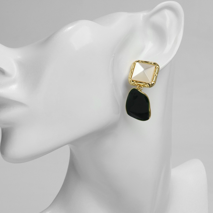 Элегантные серьги в стиле «Античность» привлекают внимание своей выразительной квадратной формой и гармоничным сочетанием белого и зелёного оттенков на золотистой основе. Благодаря длине 3,7 см они становятся заметным, но не перегруженным акцентом в образе, идеально подходящим для женщин, ценящих стиль и оригинальность.