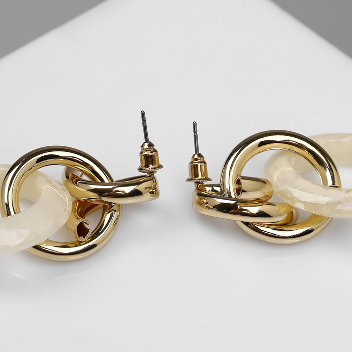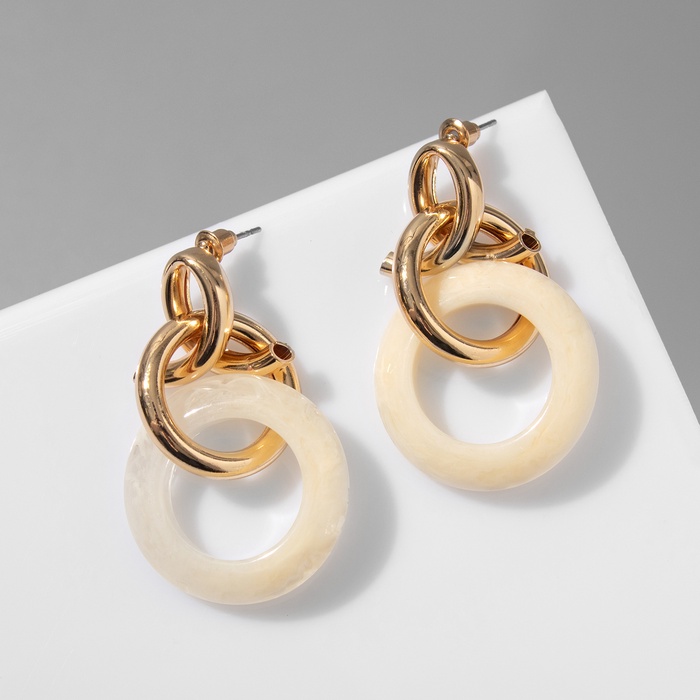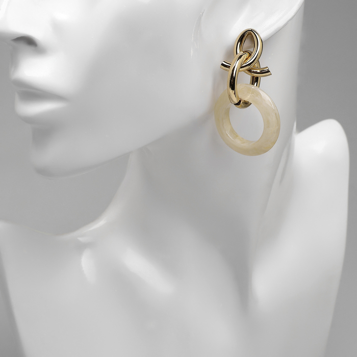 Элегантные серьги с изящным узлом в форме круга — гармоничное сочетание современного дизайна и нежных оттенков бежевого акрила на золотистой металлической основе. Их длина 4,5 см делает украшение заметным, но при этом лёгким и комфортным для ежедневного ношения.
