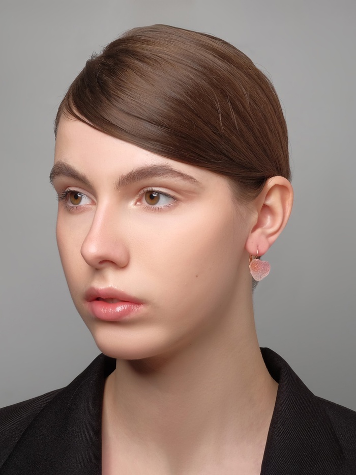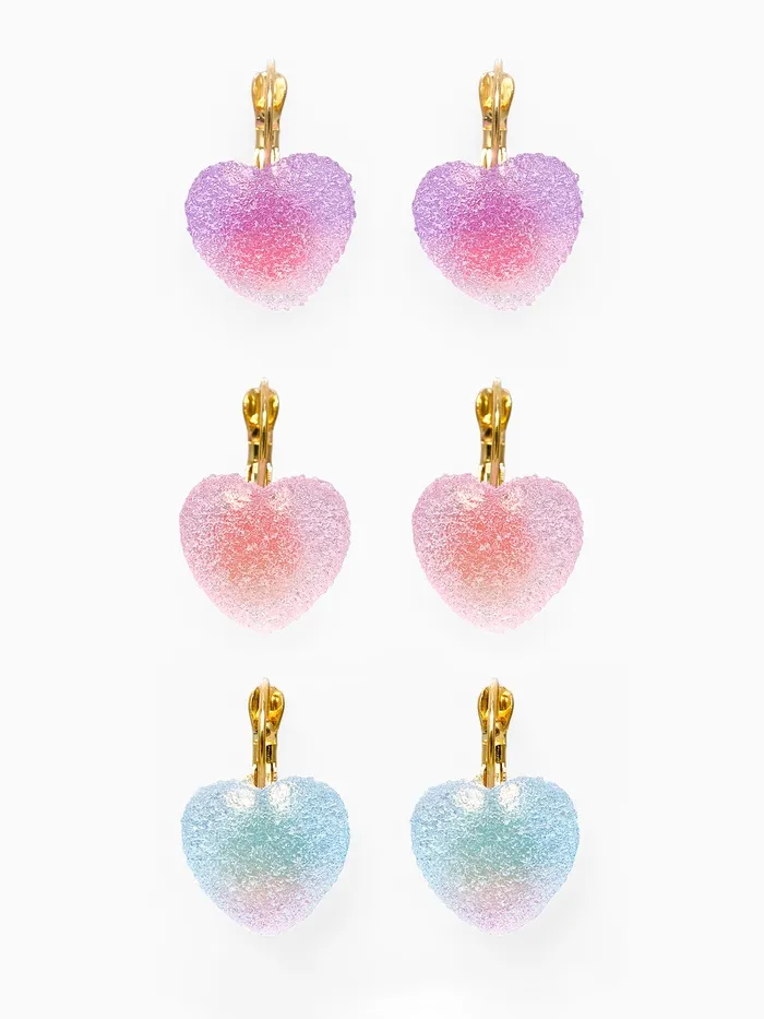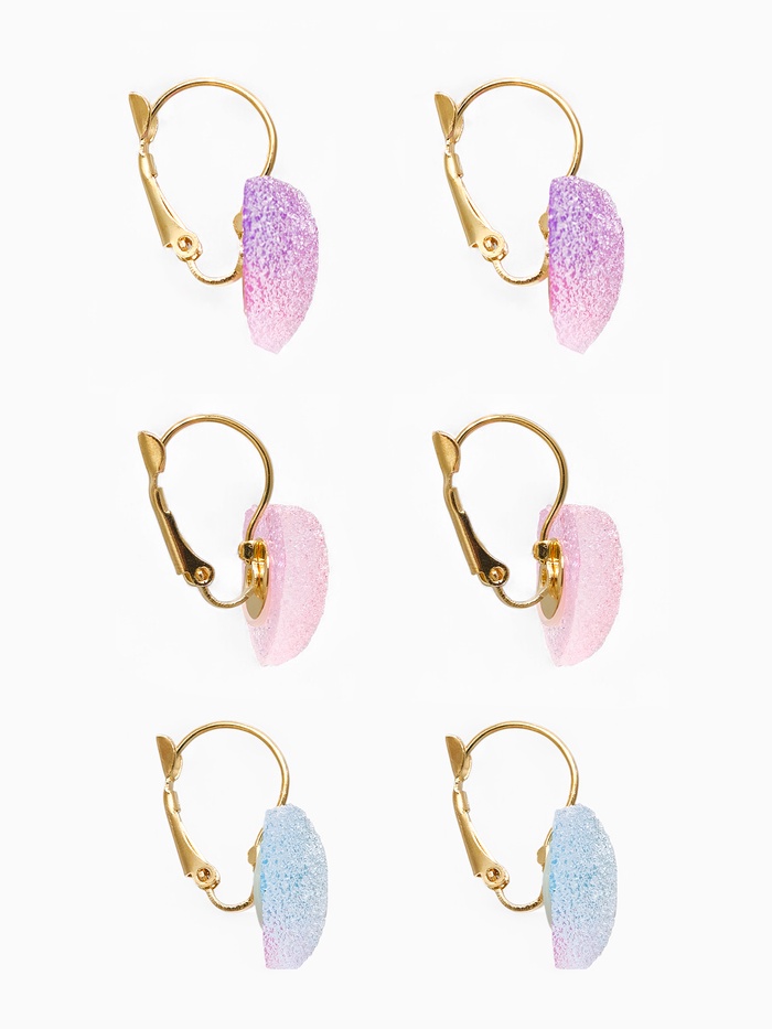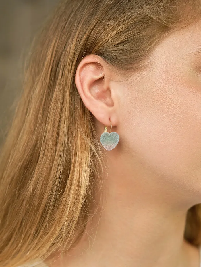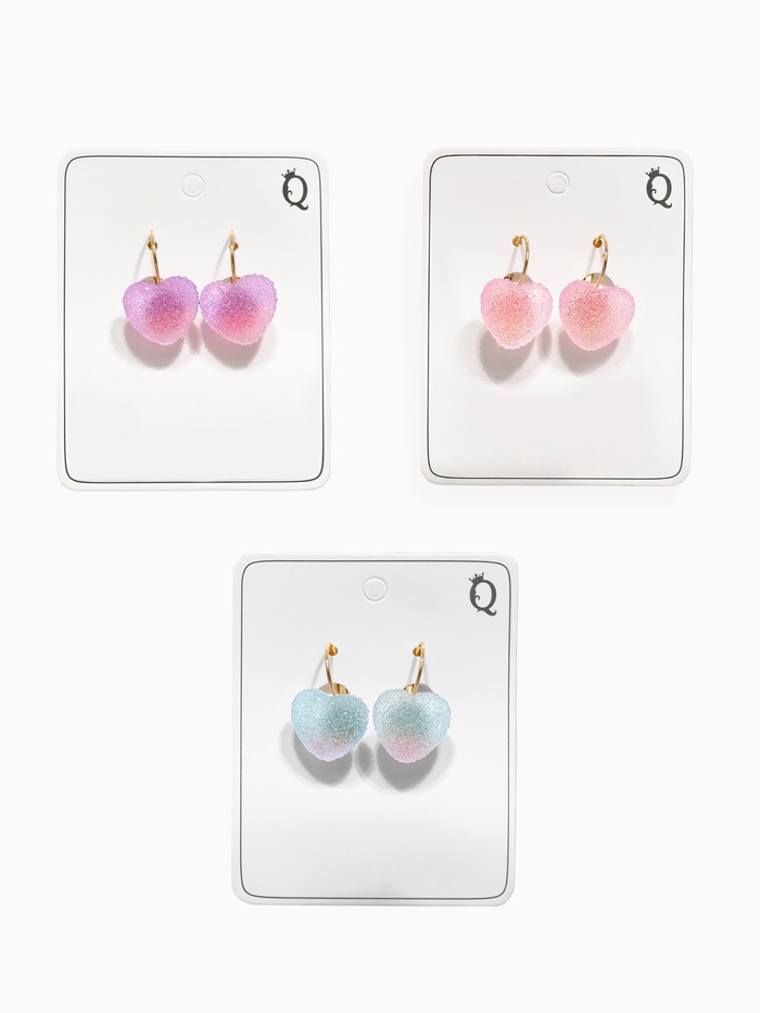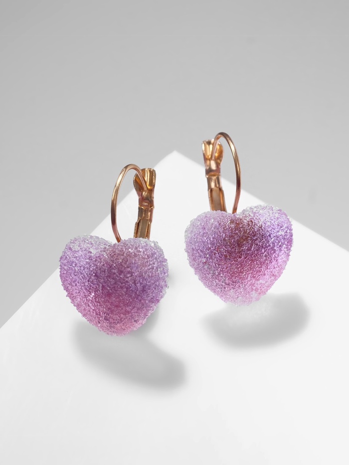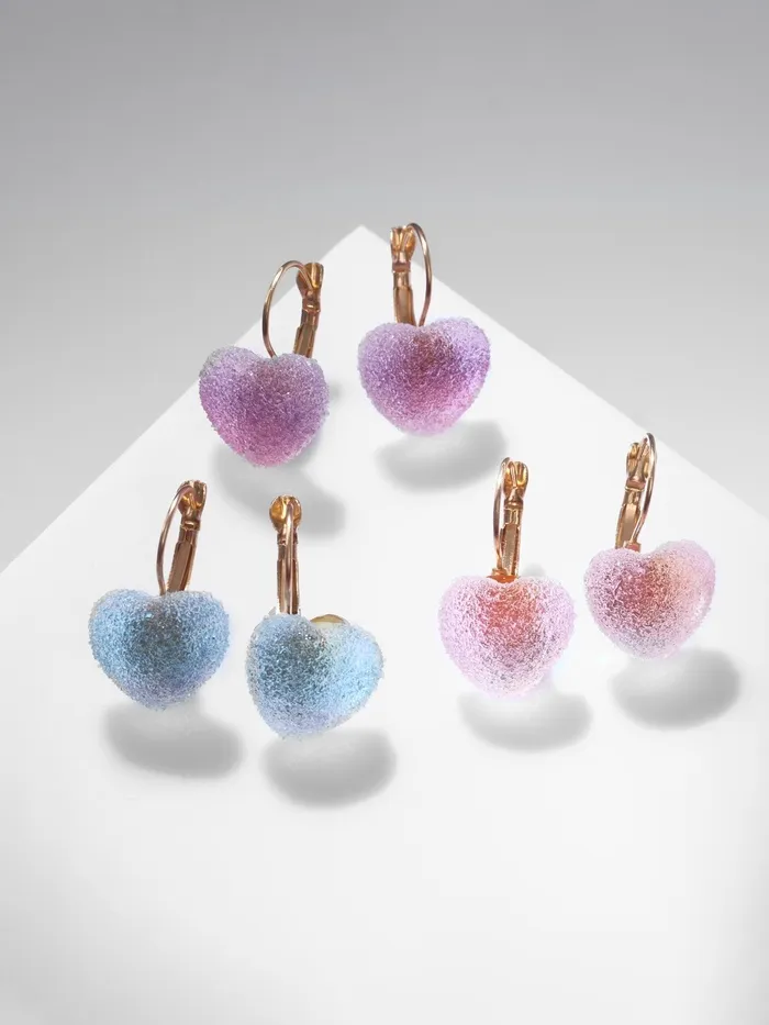 Яркие серьги в форме мармеладных сердечек, покрытых эффектом сахарной крошки, привносят в образ игривость и лёгкость. Их насыщенная цветовая палитра — голубой, розовый и фиолетовый — создаёт праздничное настроение и подчёркивает индивидуальность каждой женщины и девочки.