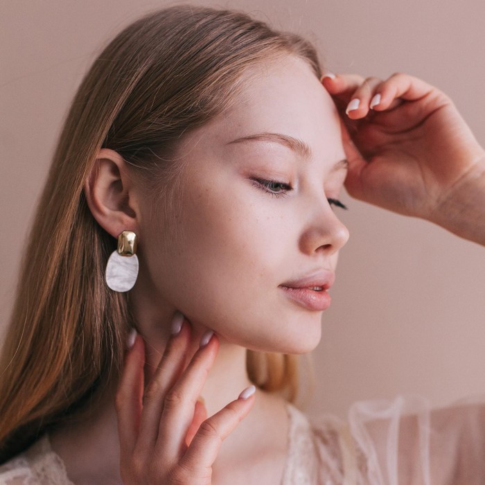 - Изысканный дизайн: перламутровые овалы с абстрактным узором создают эффект глубины и игры света, придавая образу особую выразительность.