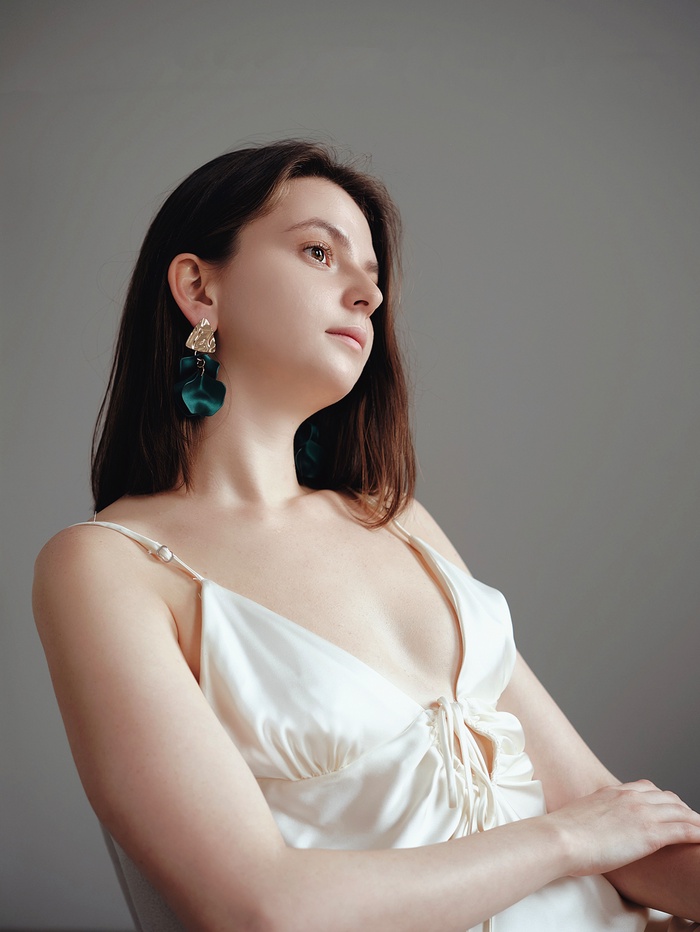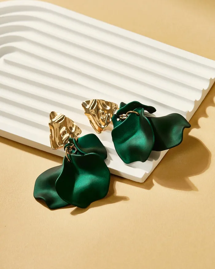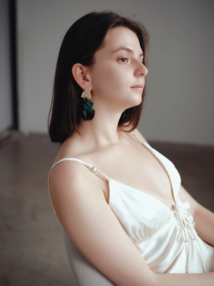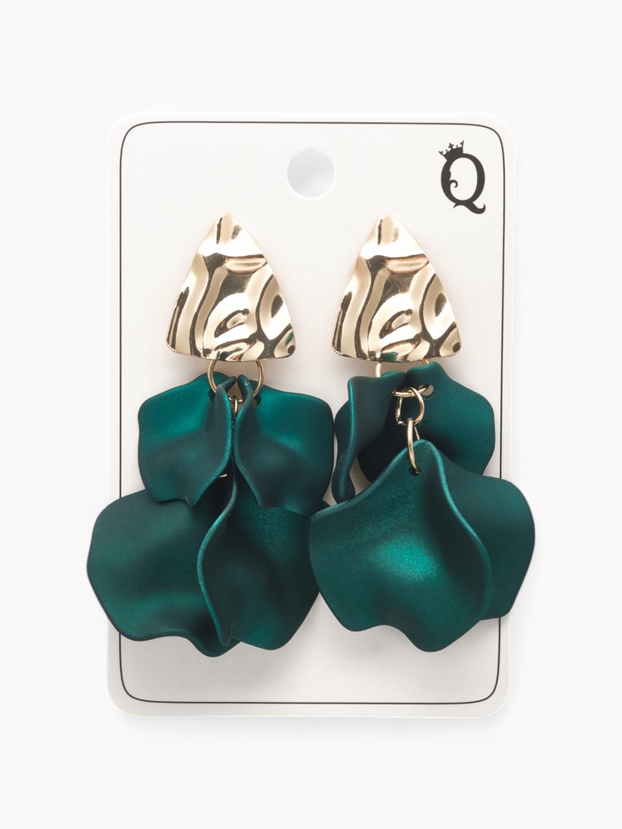 Лёгкие и выразительные серьги с эффектом мятых треугольников в насыщенном зелёном цвете привносят в образ свежесть и динамику. Их оригинальная форма и текстура напоминают порыв ветра, создавая ощущение движения и свободы, что делает украшение уникальным акцентом на каждый день и праздничные моменты.