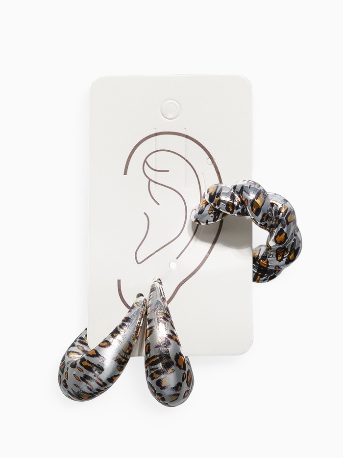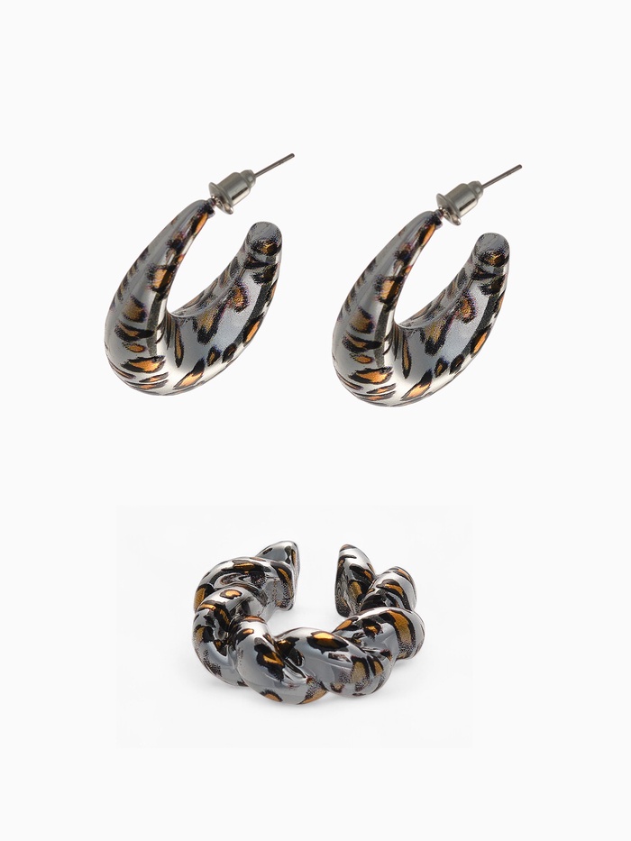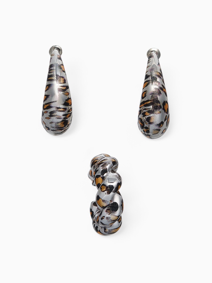 Серебристый комплект серьги и каффы с леопардовым жгутиком — это гармоничное сочетание изящества и дерзкой природной энергии. Изделия из лёгкого пластика с серебристым покрытием создают эффект благородного блеска, подчёркивая индивидуальность и современный стиль каждой женщины.
