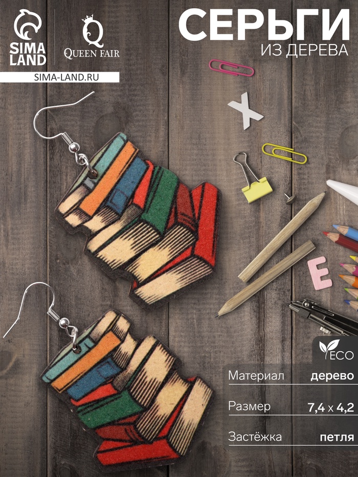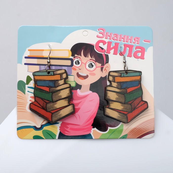 Серьги из дерева «Школа» кипа книг, цветные в серебре — Характеристики