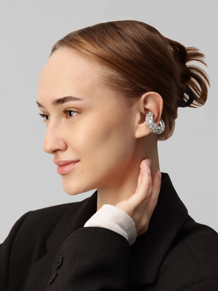 Погрузитесь в мир утонченной красоты с нашими стильными серьгами-каффами, которые станут ярким акцентом вашего образа. Эти крупные серьги с белыми стразами на серебристой фурнитуре привносят в ваш стиль элегантность и шик, позволяя вам выделяться в любой обстановке.
