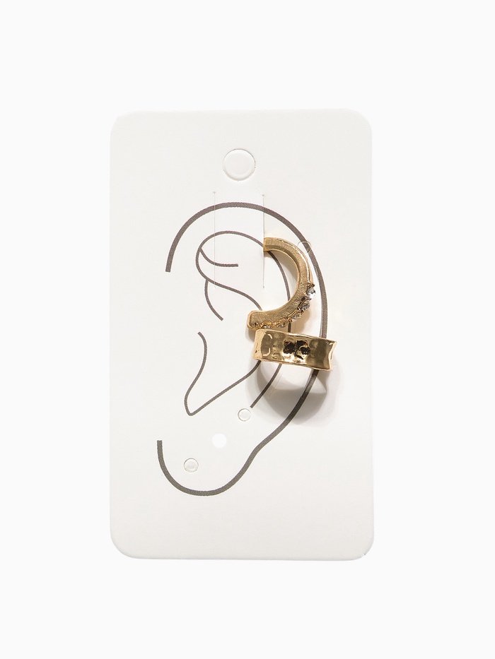 Набор из двух каффов с эффектом мятости и изящным белым оттенком на фоне золотистого металла — это современное воплощение минимализма и утончённости. Длина украшений всего 1,5 см, что делает их лёгкими и комфортными для ежедневного ношения, при этом они привлекают внимание своей оригинальной текстурой и формой.