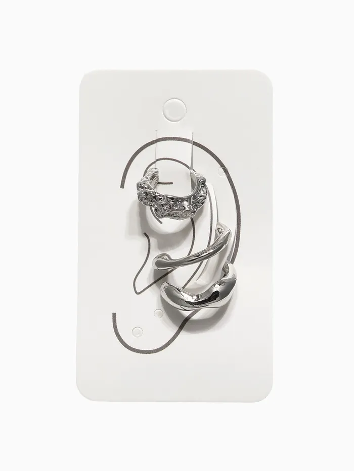 Набор из трёх серебристых каффов с эффектом мятости предлагает современный взгляд на украшения без прокола, идеально подходящий для женщин, ценящих минимализм и оригинальность. Каждый кафф длиной 1,5 см изготовлен из качественного металла, что гарантирует долговечность и комфорт при носке.