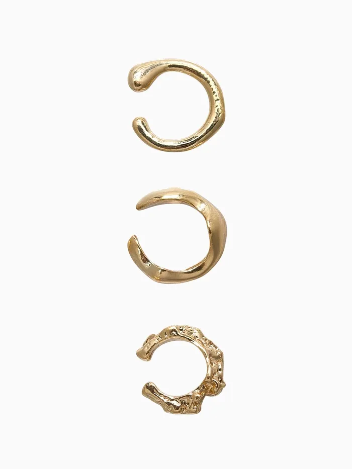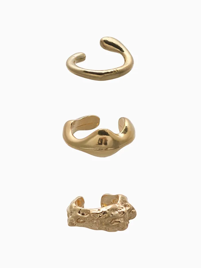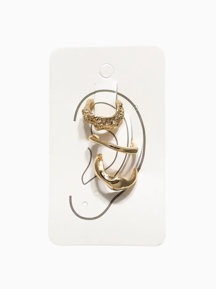 Набор из трёх золотистых каффов с эффектом мятости — это гармоничное сочетание минимализма и абстрактных форм, созданное для женщин, ценящих стиль и комфорт. Каждый кафф длиной 1,5 см выполнен из металла с аккуратной текстурой, которая придаёт украшениям выразительность без лишних деталей.