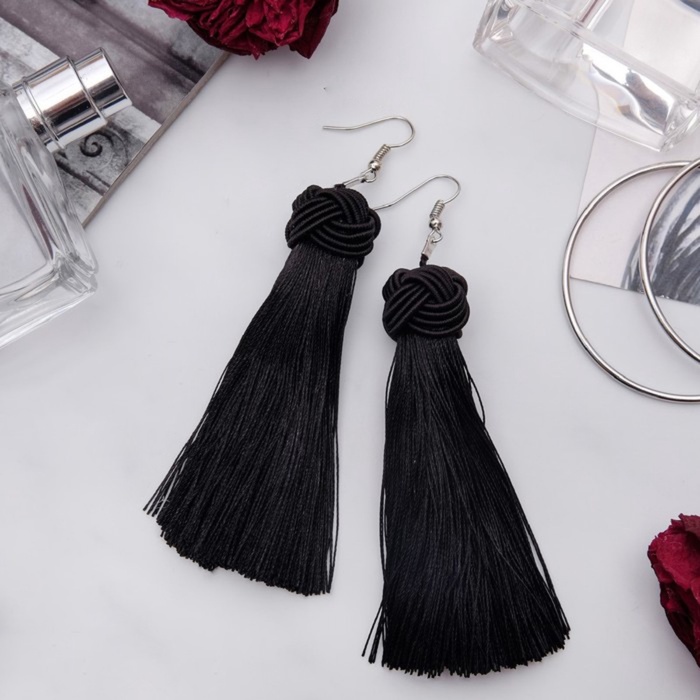 Чёрные серьги с длинными кистями в серебристой фурнитуре — это выразительный акцент, способный преобразить любой образ и добавить ему загадочности и утончённости. Их длина от 8 до 9 см создаёт эффект лёгкости и движения, подчёркивая женственность и изысканный вкус.