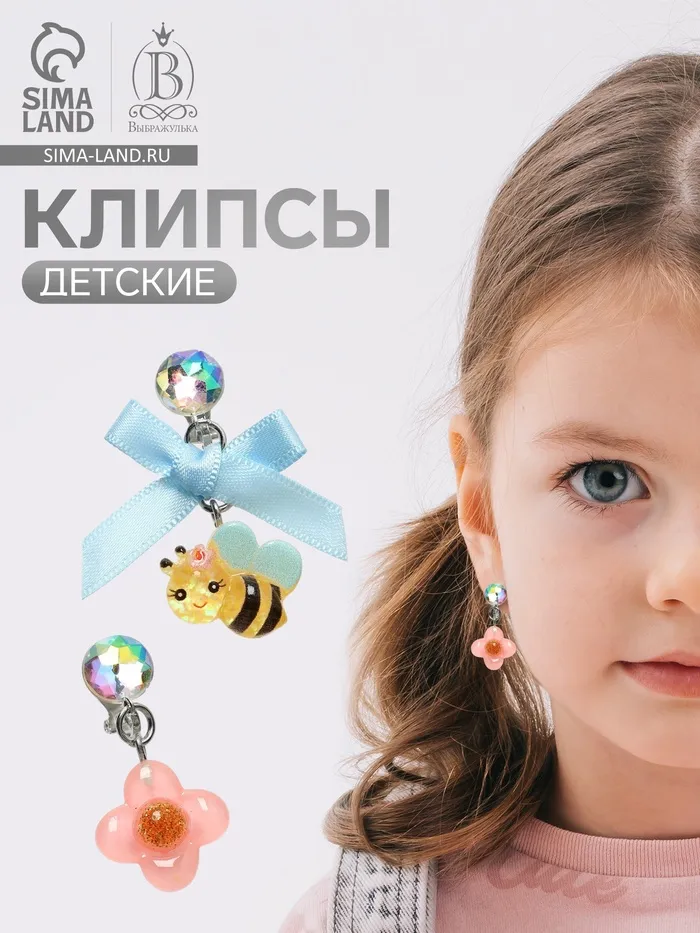 Серьги-клипсы детские "Выбражулька" пчела с бантом и цветок с кристаллом — это прекрасный подарок для вашей маленькой принцессы, который добавит яркости и радости в ее коллекцию украшений.