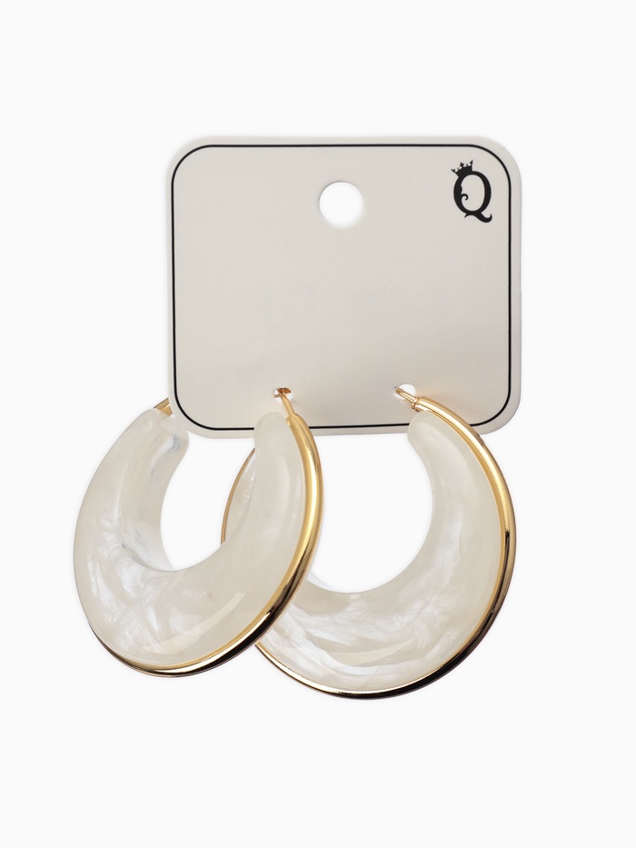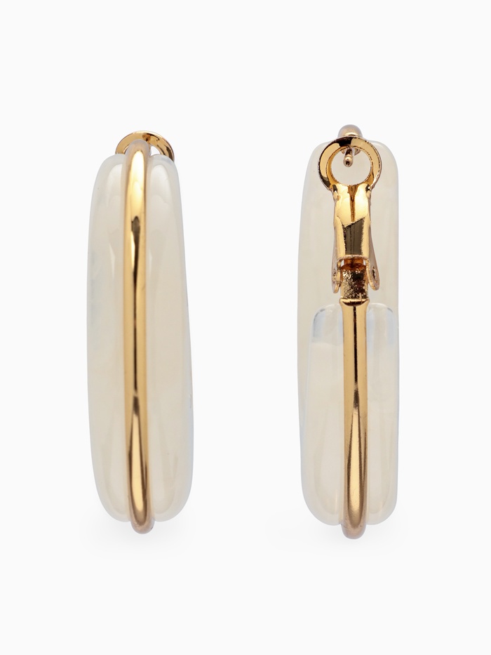 Станьте центром внимания с элегантными и современными серьгами-кольцами из полистоуна, окрашенными в нежный молочно-белый цвет и окаймлёнными приятным золотистым металлом. Небольшие и скромные, они представляют собой настоящий тренд сезона, гармонично сочетающийся с разными стилями и создаваемый руками талантливых дизайнеров.