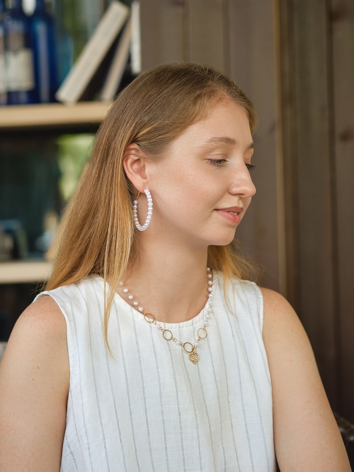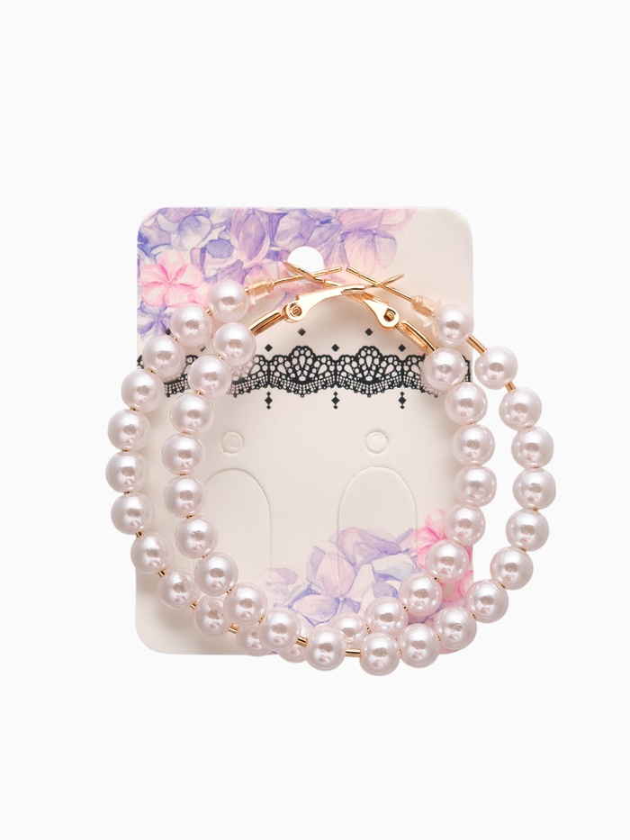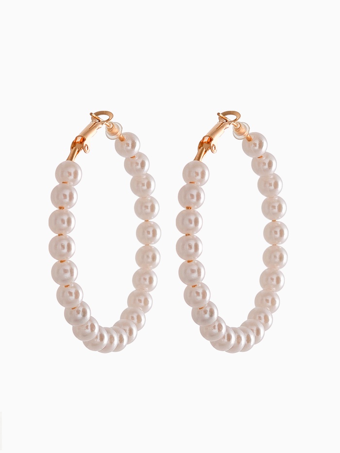 Откройте для себя великолепие, заключенное в изысканных серьгах-кольцах, которые станут акцентом вашего образа. Эти элегантные серьги диаметром 5,5 см объединяют в себе белоснежный искусственный жемчуг и сияющую золотистую фурнитуру, создавая гармоничное и роскошное сочетание.