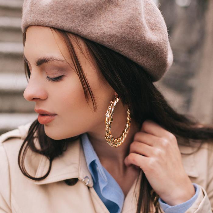 Представьте аксессуар, который гармонично объединяет минимализм и элегантность, создавая образ с нотками современного стиля — эти серьги-кольца с цепным дизайном в золотистом оттенке. Их форма в виде кольца диаметром 8 см подчеркивает тонкую линию, добавляя шарма любому выходу, от повседневного до праздничного, и подчеркивая индивидуальность носительницы.