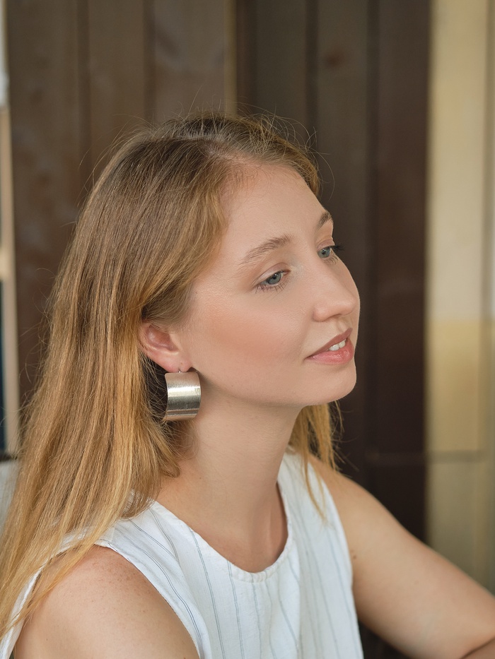 Серебристые серьги с гладкой дугой — воплощение современного минимализма и изящества. Их длина 3,5 см создаёт гармоничный акцент, который подчёркивает утончённость образа без излишней вычурности.