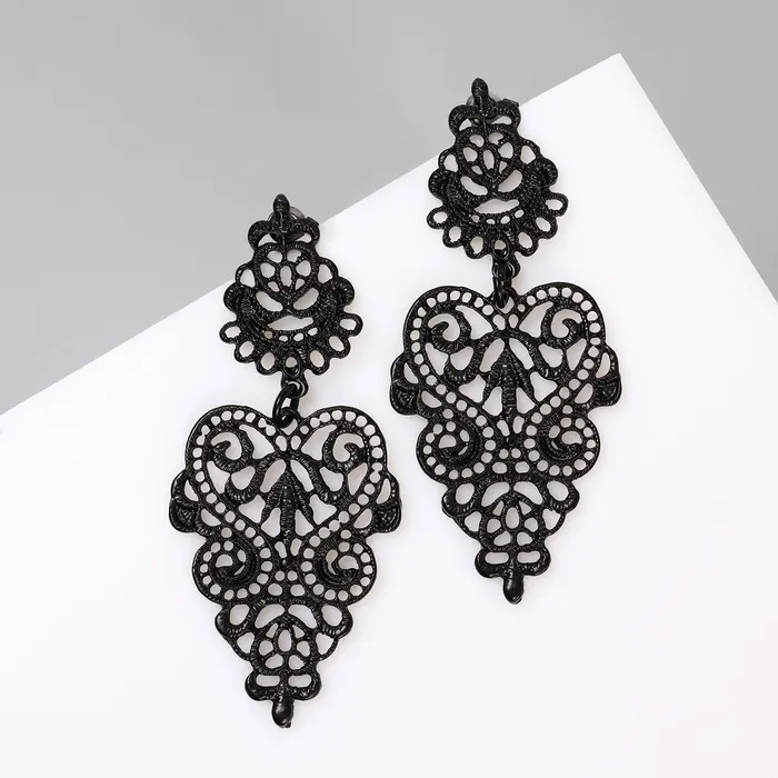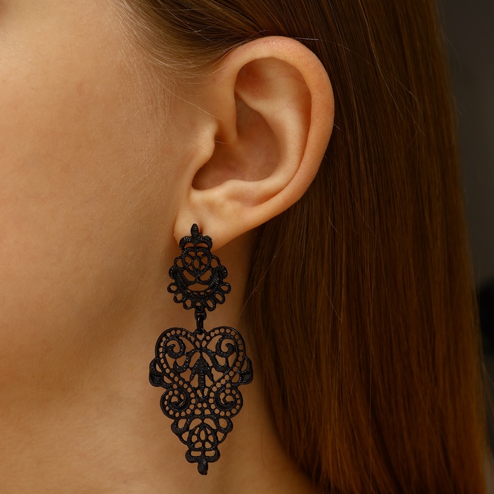 Чёрные серьги из металла с этническим дизайном привлекают внимание своей выразительностью и оригинальностью. Длина 6,5 см придаёт образу динамичность и подчёркивает индивидуальность, создавая эффект лёгкого движения и загадочности.
