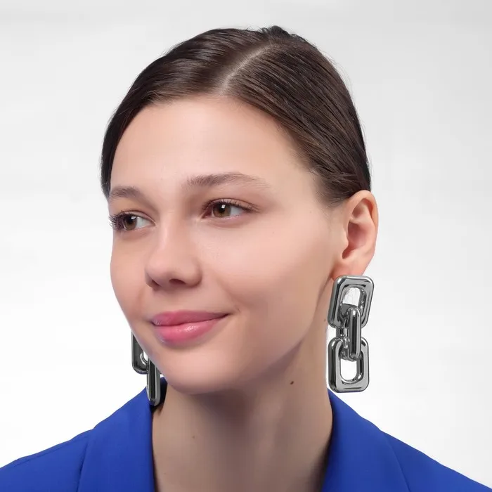 Серьги с тремя звеньями цепи, выполненные из серебристого металла с прямыми углами, — это современный аксессуар, который добавит образу выразительности и легкой дерзости. Их длина 7,5 см создаёт эффект динамичного движения, подчёркивая индивидуальность и стиль обладательницы.