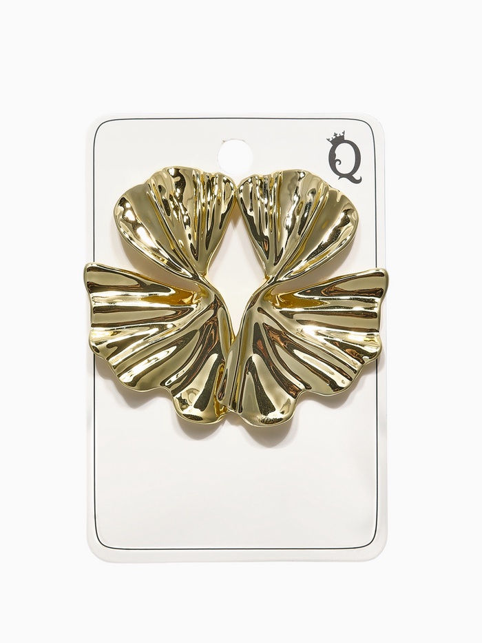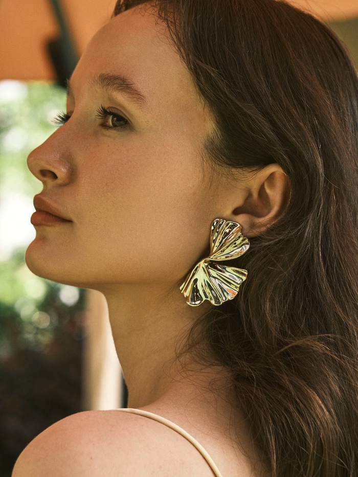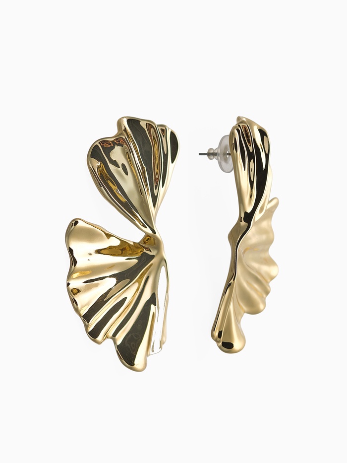 Золотистые серьги с асимметричным дизайном в виде лепестков — идеальное сочетание минимализма и природной элегантности. Их длина 6 см создаёт выразительный, но лёгкий акцент, который подчёркивает женственность и индивидуальность без излишней вычурности.