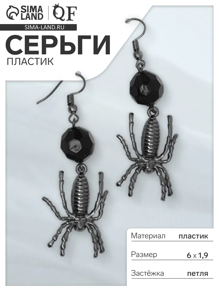 Эффектные серьги с чёрно-серым градиентом и оригинальным дизайном в виде пауков создают атмосферу загадочности и дерзости. Металлическая основа с серебристым покрытием придаёт украшению современный блеск и подчёркивает контраст тёмных пластиковых элементов, которые имитируют структуру насекомого.
