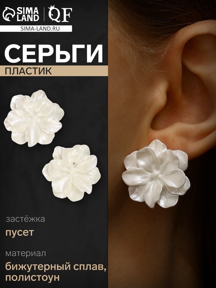 Эти изящные серьги воплощают лёгкость и утончённость в каждом изгибе, напоминая о нежности распустившегося бутона. Белый цвет с сияющим эффектом подчёркивает свежесть и чистоту образа, а гармоничное сочетание пластика и металла создаёт баланс между прочностью и комфортом.