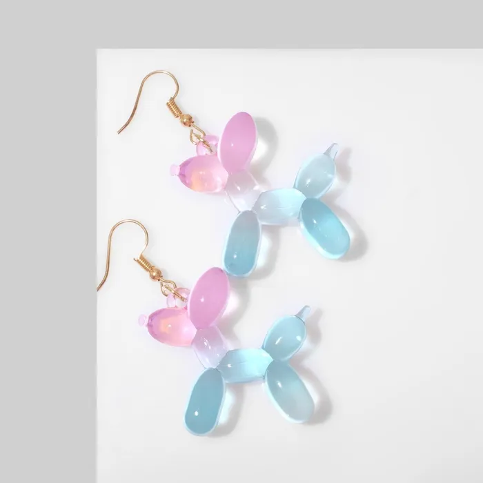 Лёгкие и игривые серьги в виде собачки из воздушного шарика станут ярким акцентом в вашем образе. Их нежная цветовая гамма — сочетание розового, голубого и прозрачного оттенков — придаёт украшению свежесть и оригинальность, позволяя выделиться среди повседневных аксессуаров.