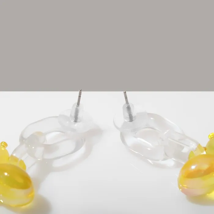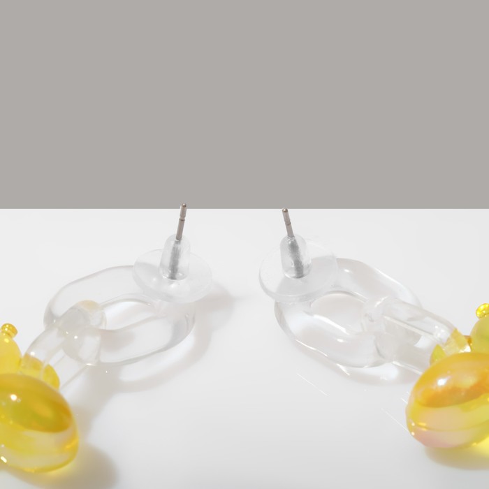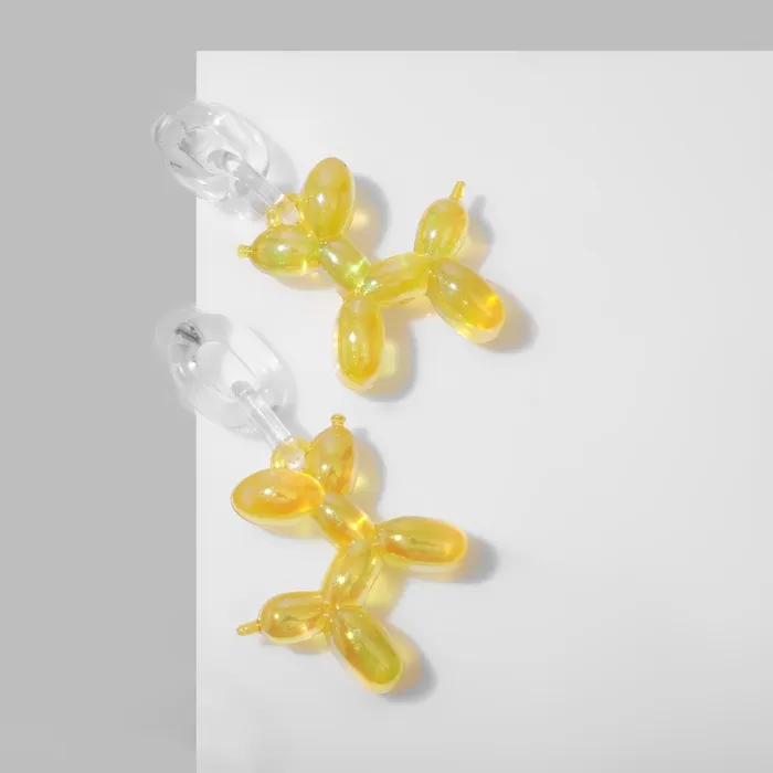 Серьги с ярким жёлтым оттенком и оригинальным дизайном в виде собачки из воздушного шара привносят в образ лёгкость и игривость. Металлическая основа с серебристым покрытием обеспечивает прочность и комфорт при носке, а пластик создаёт эффект воздушности и объёма, подчёркивая уникальность аксессуара.