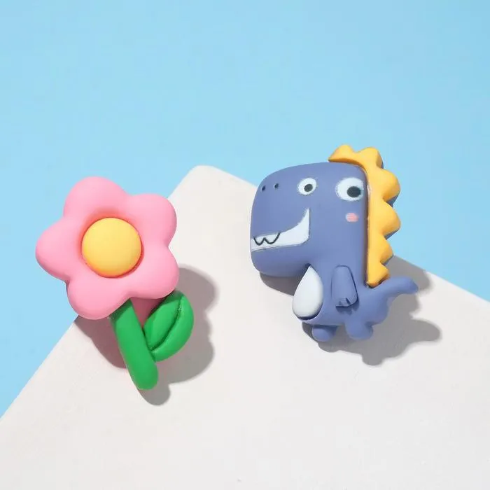 Небольшие серьги с ярким дизайном в сине-розовой гамме объединяют мотивы динозавра и цветка, создавая необычное сочетание для тех, кто ценит оригинальность в аксессуарах. Компактная длина 2 см делает их удобными для повседневного использования и добавляет лёгкую игривость образу.
