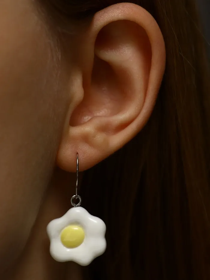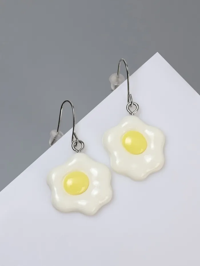 Серьги с забавным дизайном в виде глазуньи — оригинальный аксессуар для тех, кто ценит необычные детали в образе. Компактная длина 4 см и лёгкий пластик делают украшение удобным для повседневного ношения, а серебристая фурнитура добавляет современный акцент.