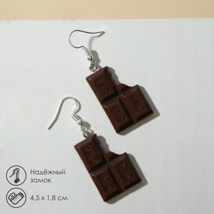 Серьги с дизайном в виде молочного шоколада — необычный аксессуар с коричневым оттенком и серебристой фурнитурой. Их длина 4,5 см создаёт выразительный, но сдержанный акцент в образе, подходящий для женщин и девочек.