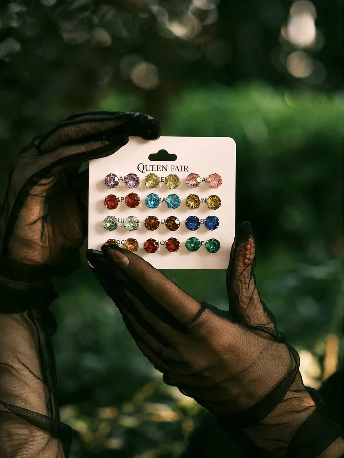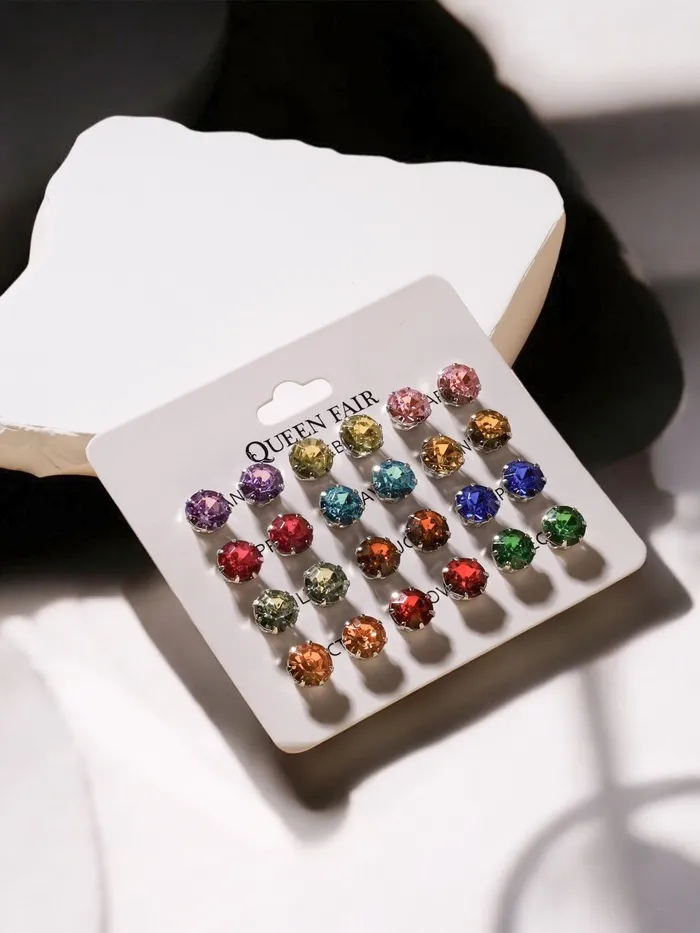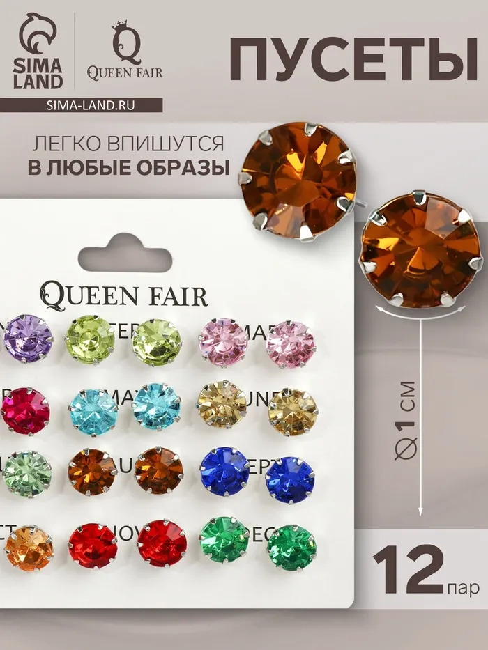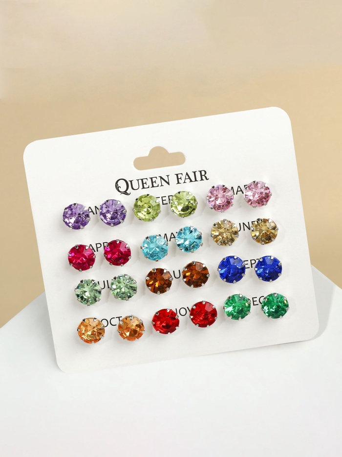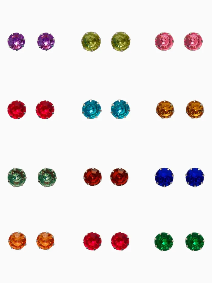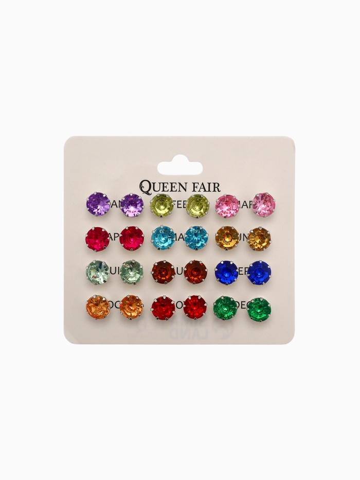 Набор из двенадцати пар крупных разноцветных серёжек-гвоздиков с серебристым основанием предлагает яркие акценты для повседневного и праздничного образа. Диаметр украшений — около 10 мм, что подчёркивает выразительность и стиль, подходящий женщинам и девочкам.
