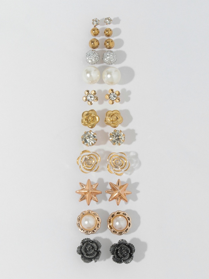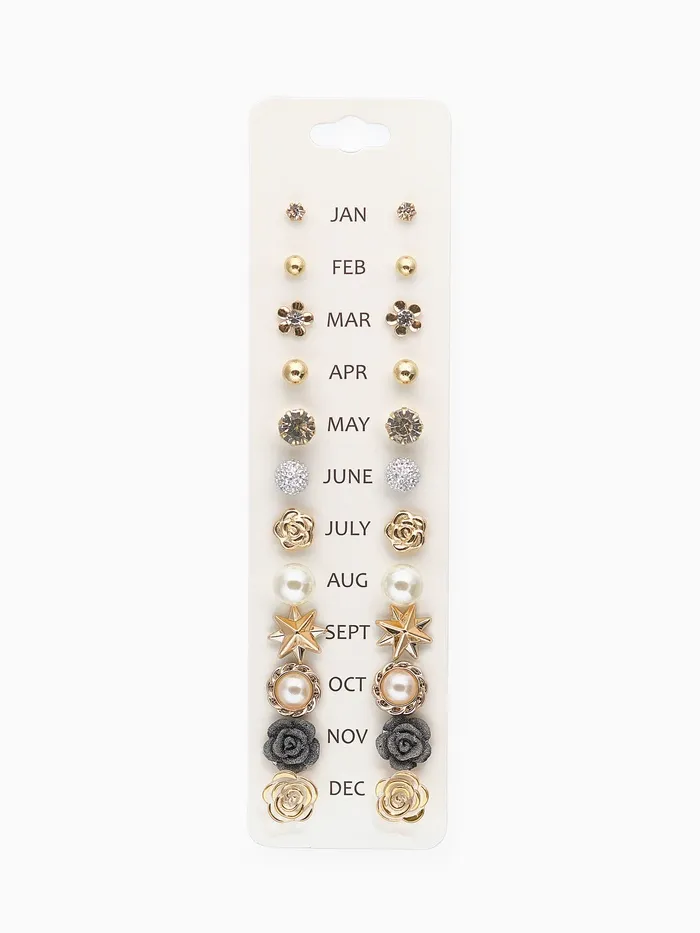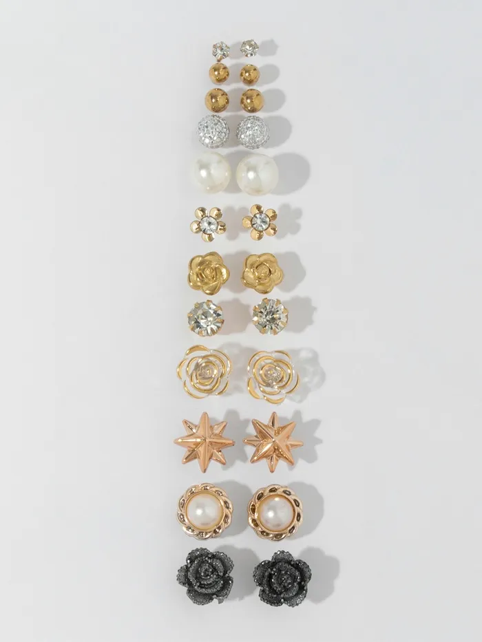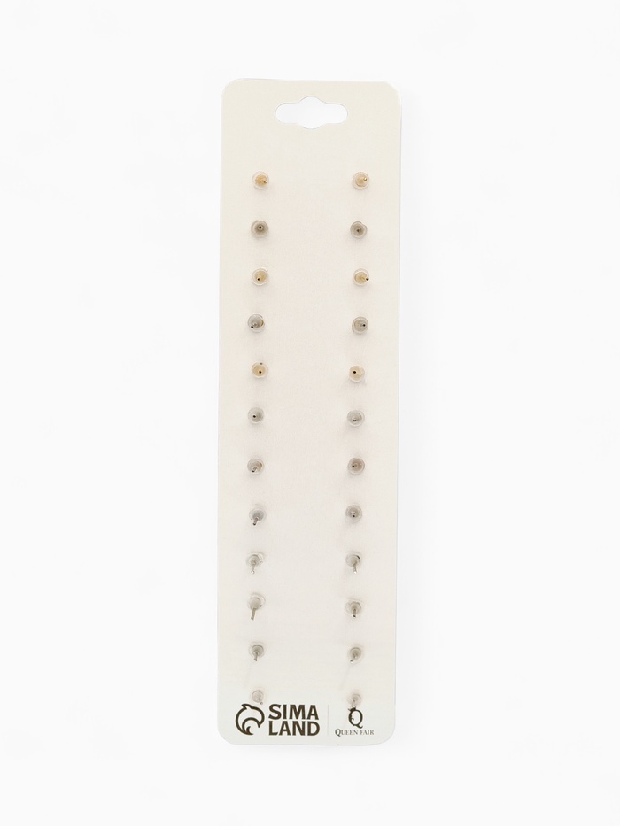 Набор из двенадцати пар серёг-гвоздиков в элегантной бело-серой гамме с золотистым оттенком фурнитуры представляет собой изысканное сочетание романтики и универсальности. Миниатюрный размер 1,1 см делает каждую пару аккуратным и нежным акцентом, который подчеркнёт естественную красоту и утончённый стиль.