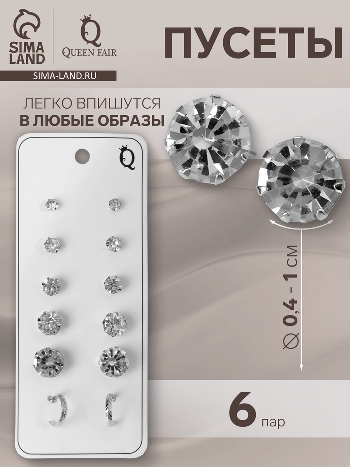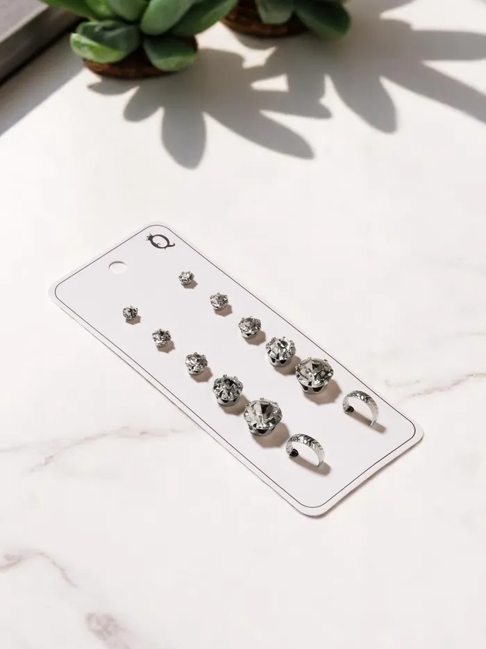 Каждая пара выполнена из прочного металла с серебристым покрытием, что гарантирует долговечность и устойчивость к ежедневному ношению. Блестящие белые стразы придают серьгам лёгкое мерцание, создавая эффект игры света и подчеркивая аккуратность и утончённость аксессуара. Застёжка-пусет обеспечивает надёжную фиксацию и комфорт при использовании.