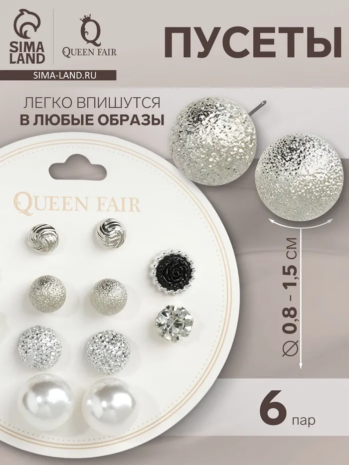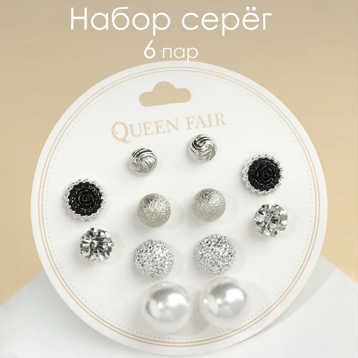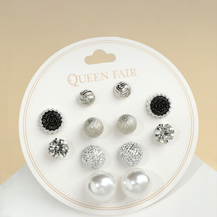 Набор из шести пар изящных пусет с жемчужными шарами в чёрно-белой гамме на серебристой основе представляет собой идеальное сочетание классики и современного стиля. Компактные серьги длиной 1,5 см легко впишутся в любой образ, подчёркивая утончённость и изысканность их обладательницы.