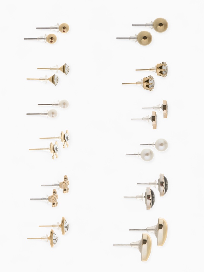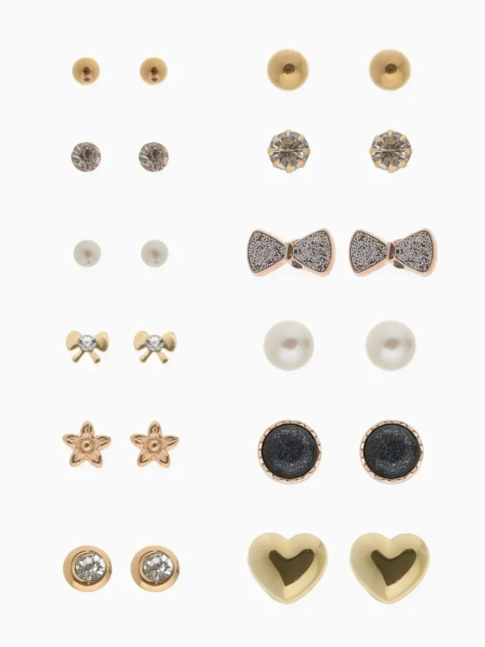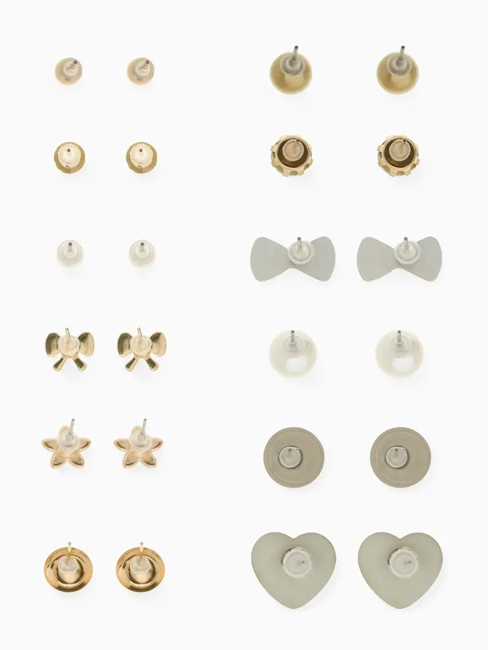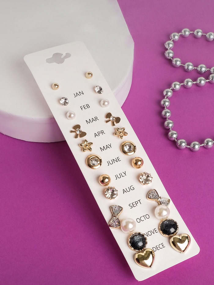 Набор из двенадцати пар стильных серег-гвоздиков в бело-чёрной гамме с золотистым основанием — воплощение утончённости и современной элегантности. Каждый аксессуар длиной 1,2 см аккуратно выполнен из металла с золотым покрытием и украшен вставками из страз, жемчуга и пластика, что придаёт украшениям особое сияние и глубину.