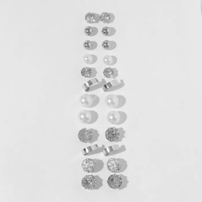 Набор из двенадцати пар серьег-пусет в строгом стиле с серебристой фурнитурой и разнообразными вставками — это гармоничное сочетание минимализма и изящества. Компактные серьги длиной 1,1 см выполнены из металла с аккуратной застёжкой-пусет, что обеспечивает надёжную фиксацию и комфорт при ношении в течение всего дня.