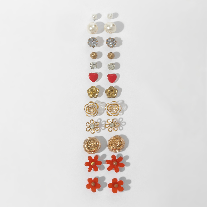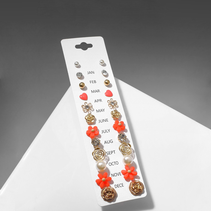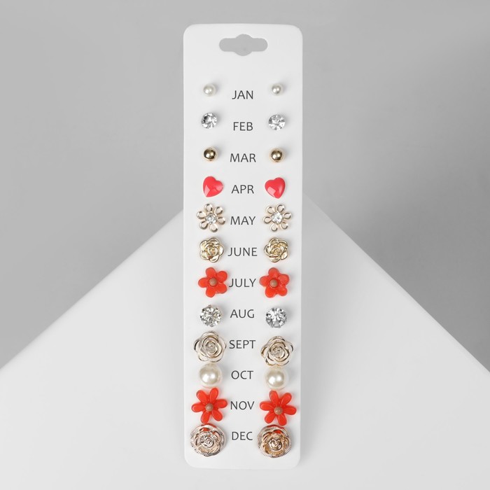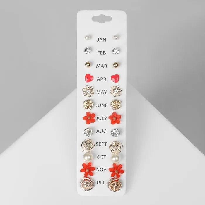 Серьги пусеты One year, 12 пар, цветочное ассорти, бело-розовые в золоте — Характеристики