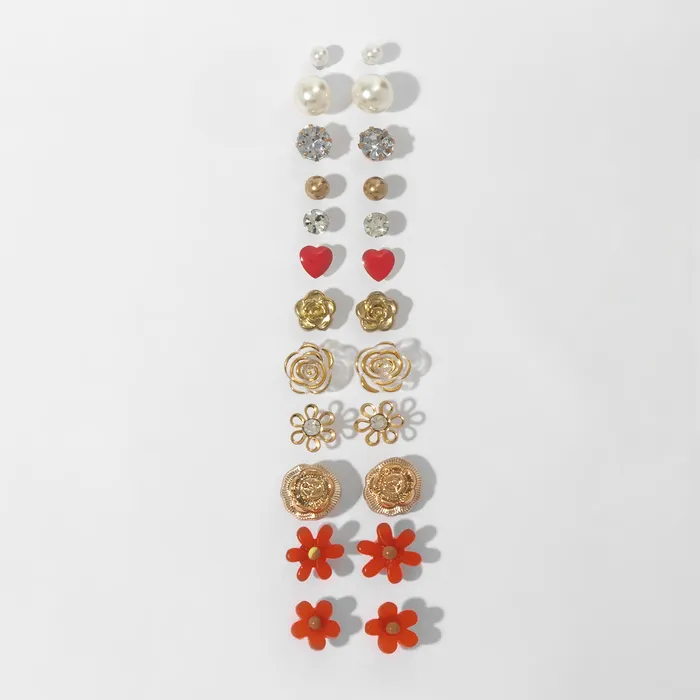 Набор из двенадцати пар изящных серёг-гвоздиков с цветочным дизайном в бело-розовой гамме и золотистом оформлении станет гармоничным дополнением к вашему стилю. Размер 1,2 см позволяет аккуратно выделить черты лица, добавляя нежности и свежести образу.