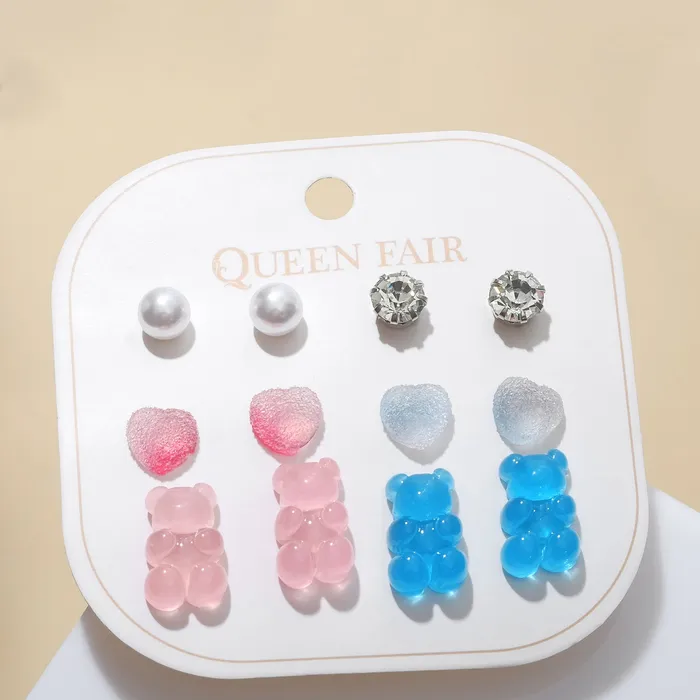 - Разнообразие в одном наборе: шесть пар серёжек с яркими и милыми мотивами мишек и сердечек в розово-голубой палитре.