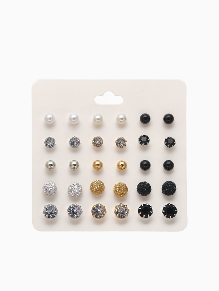 Набор из 15 пар миниатюрных пусетов с разнообразным дизайном в стильной цветовой гамме — это идеальное решение для тех, кто ценит универсальность и изящество в аксессуарах. Каждый комплект включает серьги в белом, золотистом и чёрном цветах, украшенные жемчугом и сверкающими стразами, что позволяет легко подобрать украшение под любой образ и настроение.