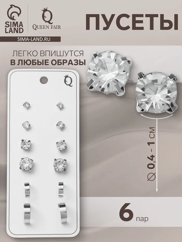Каждая пара выполнена из прочного металла с серебристым покрытием, что обеспечивает долговечность и устойчивость к износу. Блестящие вставки из страз придают серьгам сияние, создавая эффект лёгкой игры света и добавляя образу свежести и изящества. Застёжка-пусет гарантирует надёжную фиксацию и комфорт при использовании.
