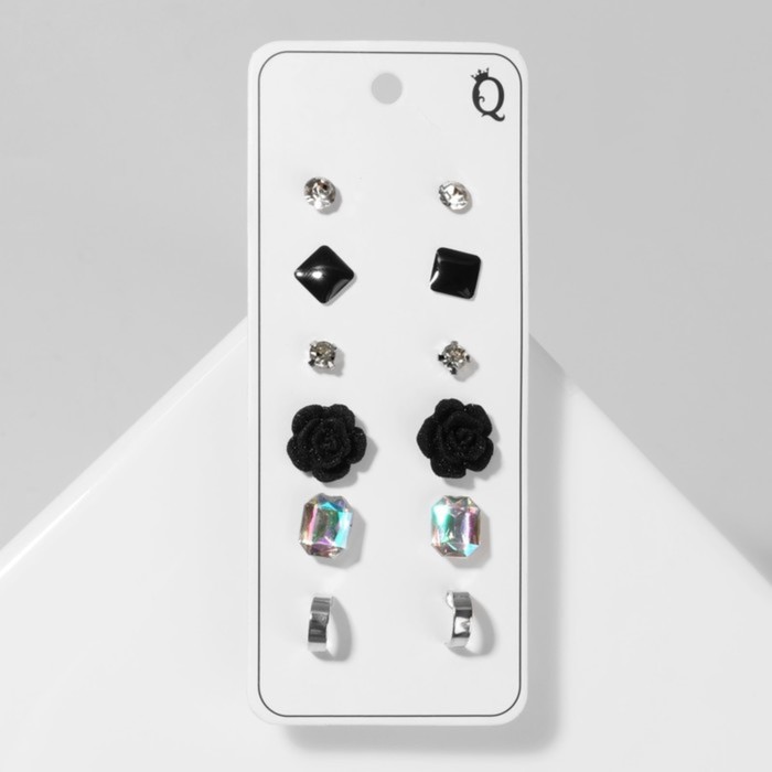 Серьги пусеты QF «Романтика», 6 пар, розочка, чёрно-белые в серебре — Характеристики