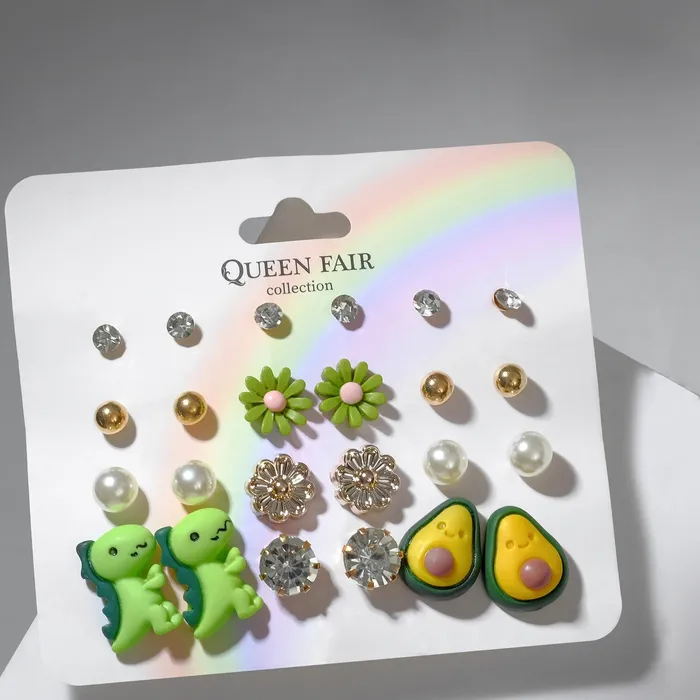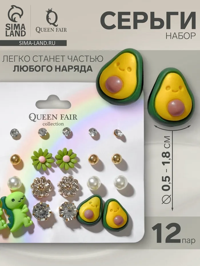 Серьги пусеты QF «Вкусняшки», 12 пар, динозаврик и авокадо, цветные в золоте — Характеристики