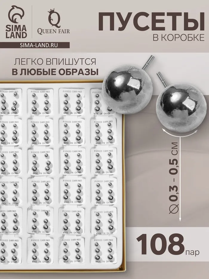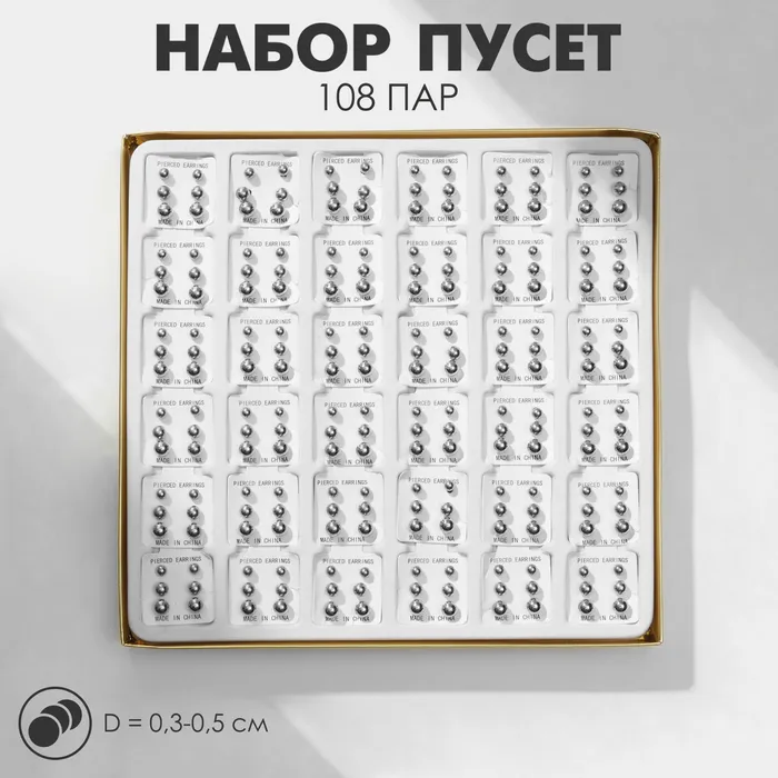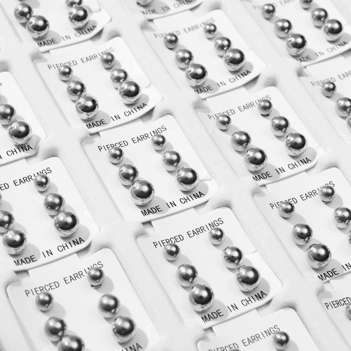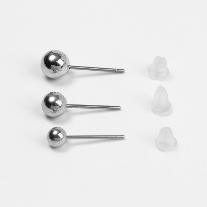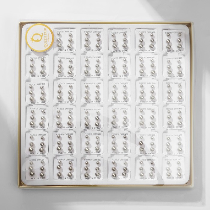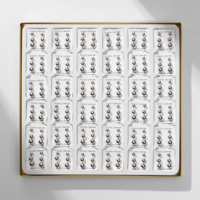 Серьги пусеты в коробке QF «Ассорти» 108 пар, бусины №3, 4, 5, цвет серебро — Характеристики