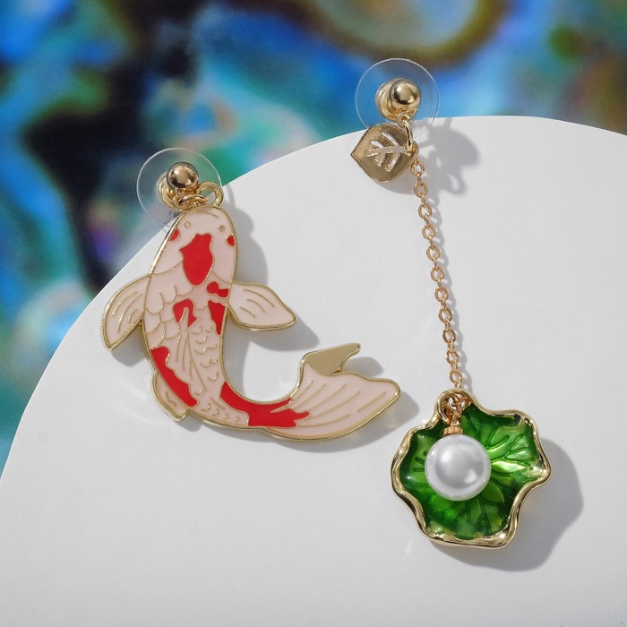 Серьги с эмалью «Ночь» рыбка с ракушкой, цвет красно-зелёный в золоте — Характеристики