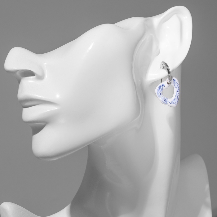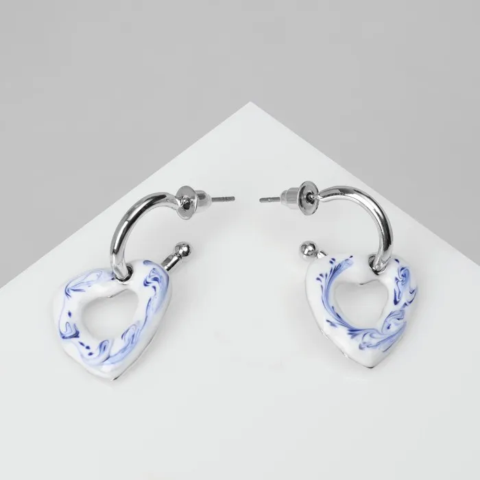 Серьги с эмалью «Сердце» разводы, цвет бело-синий в серебре — Характеристики